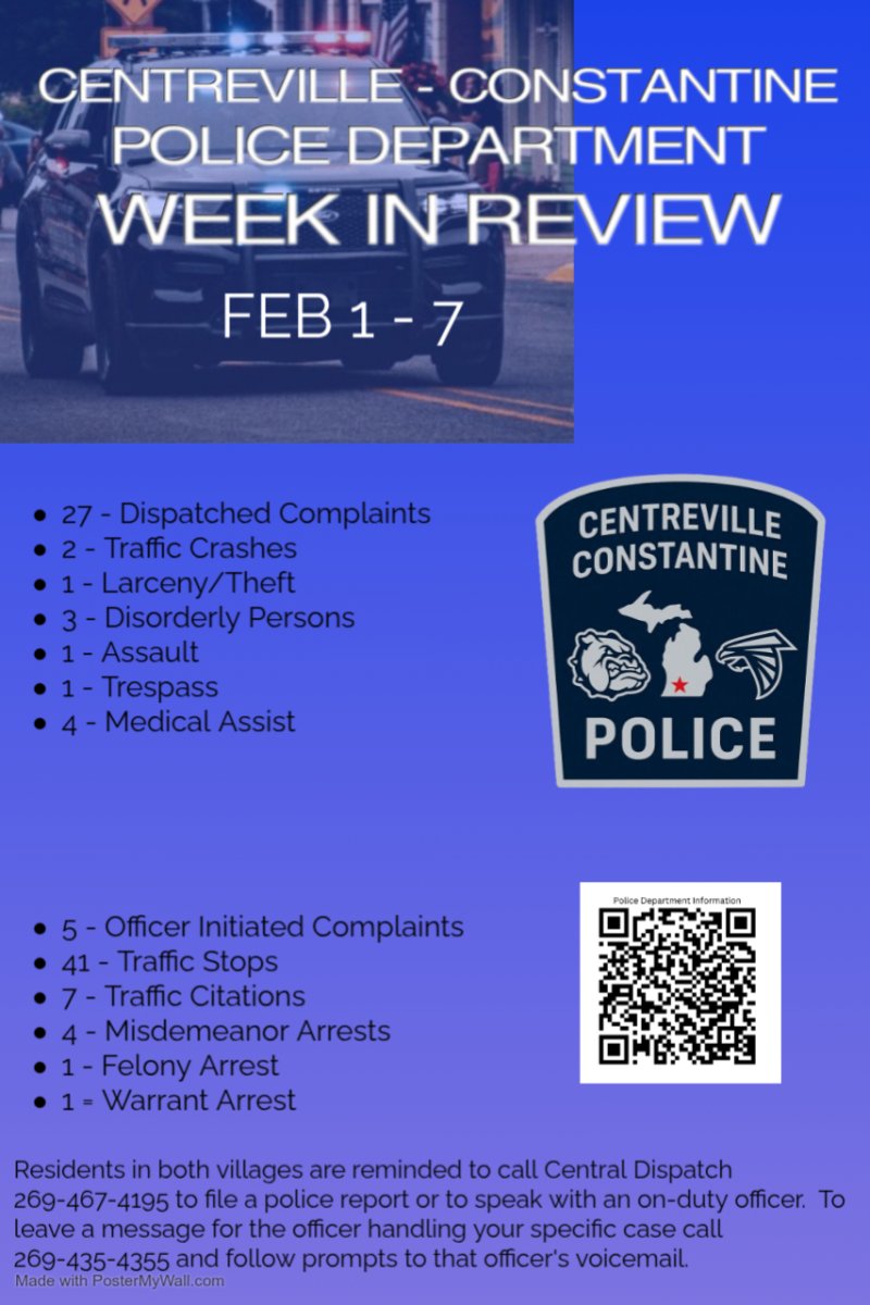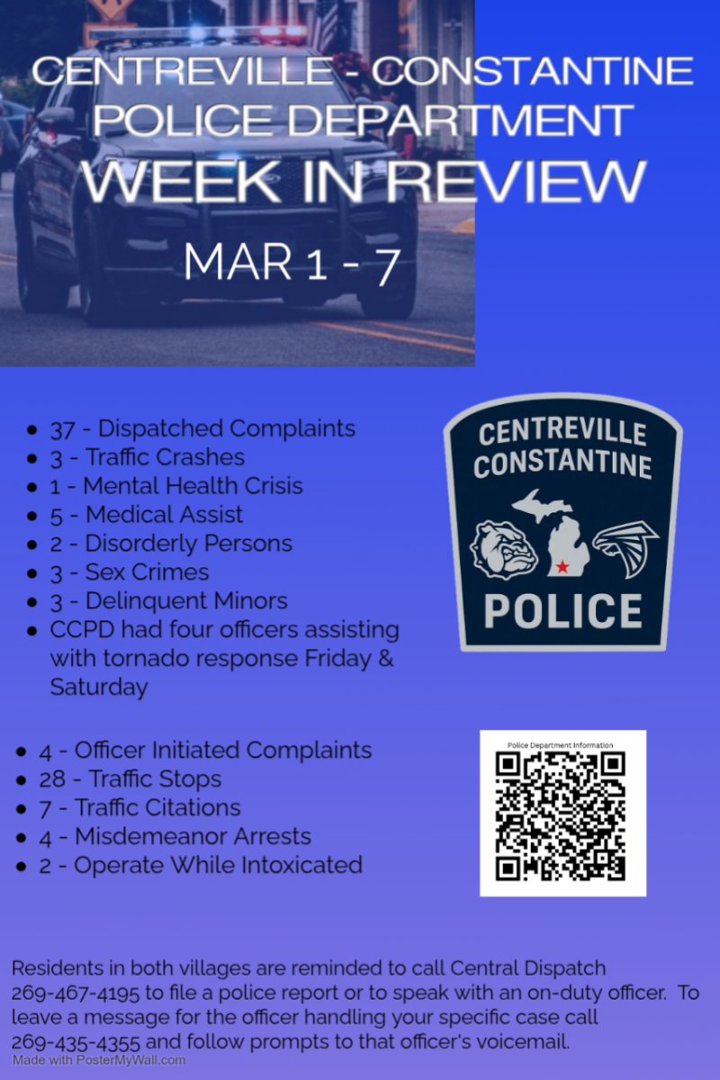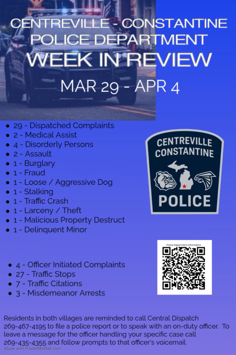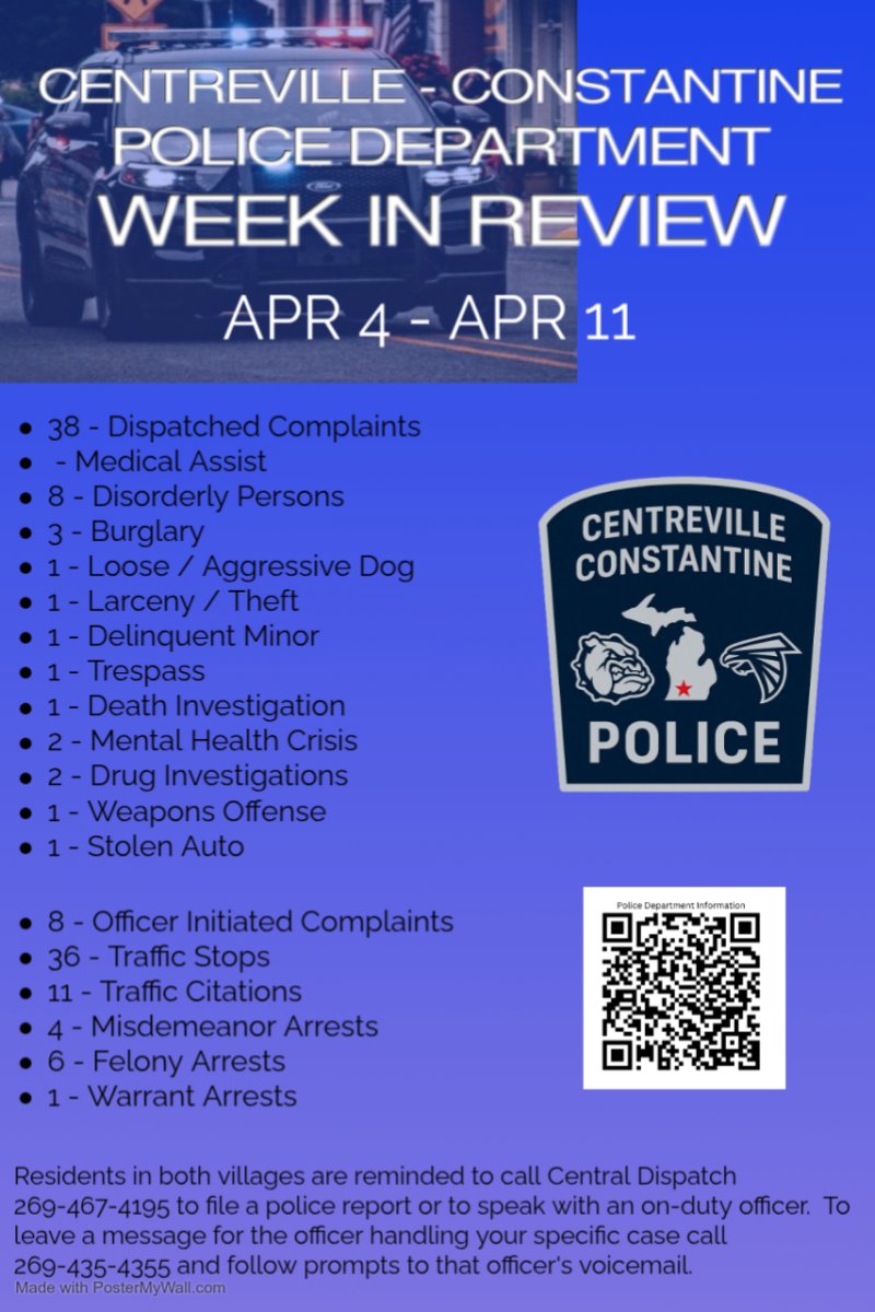 I would also like to take this time to remind everyone, office hours are not “fixed” in either village, therefore office phones are not always staffed. Our officers are most readily contacted on the police radio, so if you need to speak with a police officer, you must call Central Dispatch. If an emergency, dial 911. The non-emergency number for Central Dispatch is 269-435-4355, however please understand you may not receive a reply for more than a week, depending on that officer’s schedule. So, if you need assistance right away, you must call Central Dispatch to speak with an on-duty officer.